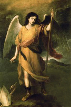 「トビト書」に書かれているラファエルは、トビトの息子 トビアスと一緒に旅をし、旅の途中、トビアスに魚の内臓から膏薬を作ることを教え、彼をずっと守り続けます。
