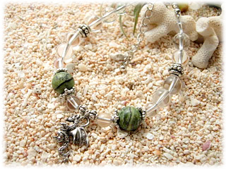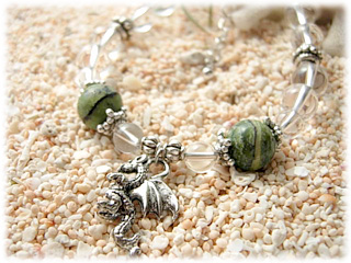 グリーンオパールはドラゴンアイとも呼ばれている石で、鉱物学的にはオパールの成分である蛋白石とセレナイトであるジプサム(石膏)それに石英が加わった混合石です。 自然のスピリットや妖精、ディーバ達との結びつきがとても強く感じられる石です。 私達にエレメントの持つパワーをもたらしてくれます。 西洋ドラゴンのチャームと合わせた、このブレスレットはドラゴンのパワーを呼び込んでくれます。 私達に情熱と勇気を与え、変容を助け、宇宙の法則に基づく豊かさをもたらします。