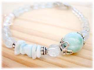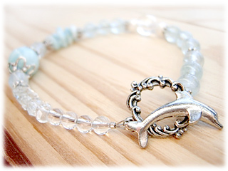 アクアマリン、ラリマーと、ドルフィンをかたどったマンテルを使ったブレスレットです。 ラリマーは別名ブルーペクトライトやドルフィンストーンとも呼ばれ、カリブ海に浮かぶ、ドミニカ共和国でのみ産出されます。 まるで光に輝く海の波のような色と模様を持ち、カリブの美しい海のエネルギーが転写されている石です。 アクアマリンは海の水を現すその名の通り、海の色をした石です。その昔、船乗り達は海の力が宿った石として、大切にお守りにしていました。 海は、母なる大地の子宮。 私達生命の源であり、いのちを優しく育んでくれます。 また、海はあらゆるものを浄化する作用を持っています。 アクアマリン、ラリマーを使ったこのブレスレットは、海のエネルギーで私達を優しく包み込み、あらゆるネガティブなものを浄化させます。 そして、あなたが握りしめている、いらなくなったエネルギーを手放すことを、優しく諭します。 感情を鎮め、穏やかな海のように内なる平和の心であること、自然の流れに身を任せ、穏やかに生きることをサポートしてくれるブレスです。
