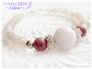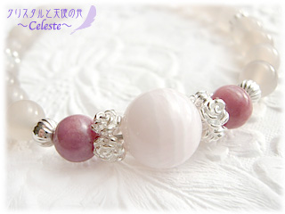 ピンクライトグレームーンストーン、ピンクカルサイト、ロードナイトを使ったブレスレットです。