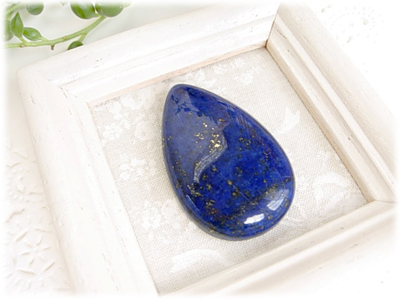 ラピスラズリの美しいカボションです。 青の中に金色のパイライトがキラキラ光り、まるで夜空の星の輝きのようです。 古来より魔よけのパワーがあると信じられ、古代エジプトでは粉末にしたものを目の回りにアイシャドウのように塗ったりしていました。 まさにラピスラズリの持つエネルギーは「目」に関係しています。 ラピスラズリは第三の目を開き、深いものの見方と明確さを与え、物事や霊的な学びを見通す力を与えます。 悟りを促し、個人の力やサイキックな能力を高めます。 喉のチャクラにも働きかけ、第三の目を通した霊的な真実を自己表現することを助けます。