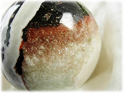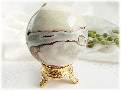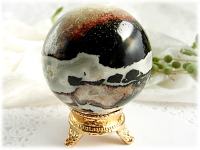 スレイマンは南インドで産出されるアゲートの一種です。 白と黒を基調とした縞模様が特徴です。 ダライラマの主治医が探し求めたという伝説を持つこの石は、非常に強い保護エネルギーとグラウンディングのエネルギーを持っています。 否定的なエネルギーを取り除き、子供時代のトラウマや過去世での心の傷を癒して解消させます。 陰陽のバランスを取り、ハートを開かせます。 この石はネガティブ・エネルギーを非常に強く吸収し、ワークを行う際には、この石自らの意思でワークする者を浄化します 。 すべてのネガティブエネルギーから身体や所有物を守ります。 ヒーリングのパワーを持つこの石は、ヒーラーやライトワーカーが持つと振動するといわれます。 直径が約50mmのスフィアです。 手に丁度馴染むくらいの大きさ。 白と黒の他に、グリーンをまぶしたような色合いが入り、キラキラと輝くように見えます。