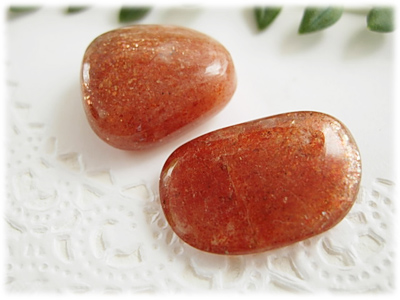 タンブルに磨かれたサンストーンです。 サンストーンは、ムーンストーンと同じ長石の仲間です。 内部に赤鉄鉱や針鉄鉱の微細な薄片状結晶を含み、太陽にキラキラと輝くことからサンストーンと名付けられました。 その名の通り、光のエネルギーを持つ石で、私達に太陽の力をもたらします。 生きる喜びや、自尊心、自信を高め、本当の自分が楽しく輝けるようにします。 第2、第3チャクラを活性化させ、高次の知識に則して行動することを促し、利己的な考えやエゴに基づいた考えを手放なすことを助けます。 直感力を高め、リーダーシップの力を教えます。