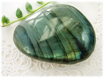 タンブルに磨かれたラブラドライトです。 カナダのラブラドール地方で発見されたことから、ラブラドライトと名付けられました。 ムーンストーンなどと同じく「長石」の仲間で「曹灰長石」といいます。 特徴は、一見グレーの石の色を持ちながら、光をあてることによりイリデッセンスという特有の虹色の光を放つことです。 この光は組織の中に含まれる成分と、層状の組成から光の反射が生まれることにより輝きます。 「ラブラドレッセンス」と呼ばれる輝きは、宇宙の光を表しているといわれています。 混乱したエネルギーを素早く静め、ネガティブなエネルギーや霊を追い払います。 高次の意識へ到達できるようにオーラを整えます。 宇宙の智慧をもたらし、物質界で生きるための真理へとつなげます。 直感力やインスピレーション、霊感やサイキックな能力を高めます。 ブルー〜ブルーグリーンに輝くきれいなものを厳選しました。 手に握ってちょうど良い大きさです。